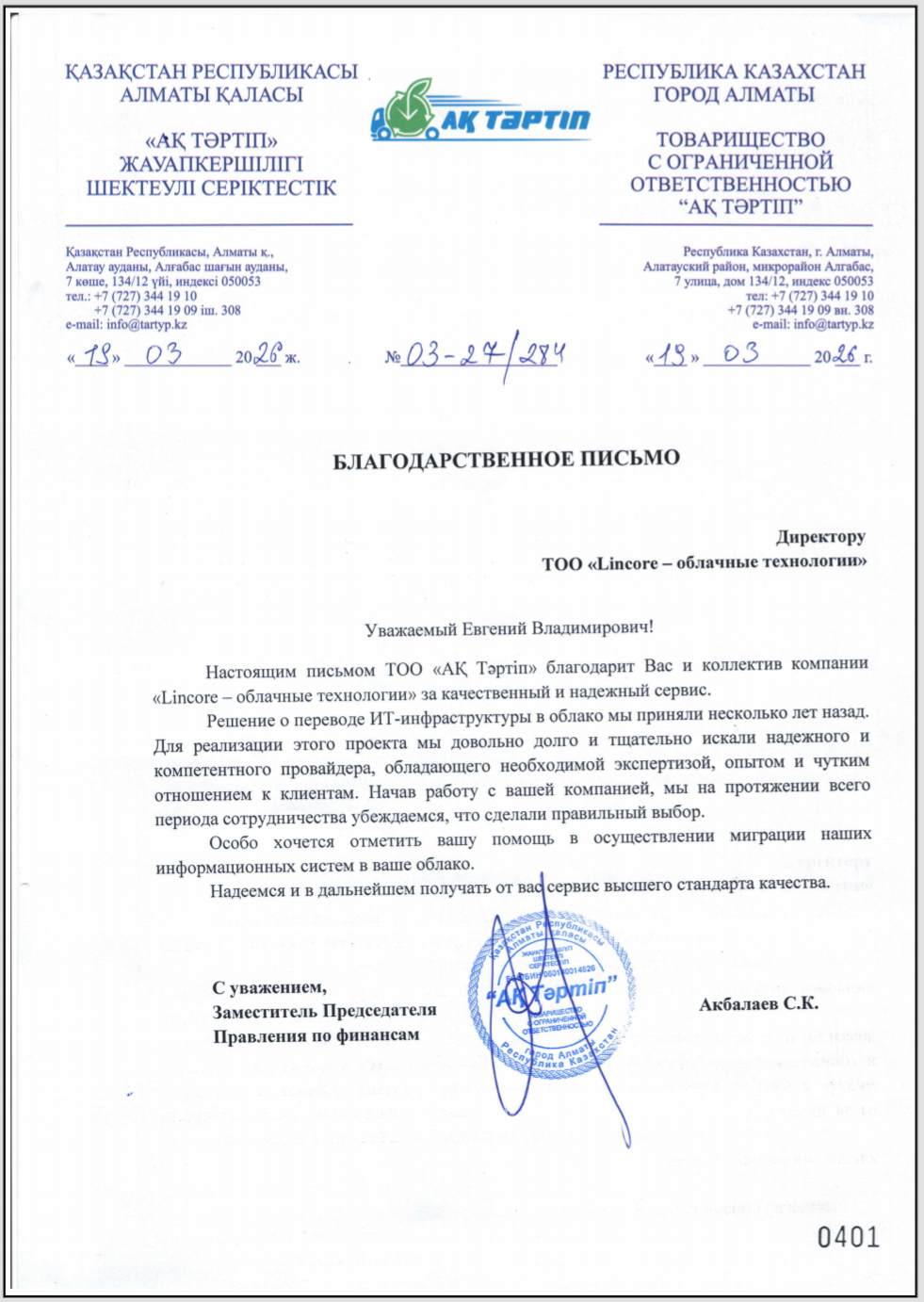 Лидер отрасли по сбору и вывозу коммунальных отходов компания "АҚ ТӘРТІП" в 2023 году сделала выбор в пользу нашей облачной платформы для размещения ИТ - сервисов. Спустя 3 года мы получили оценку в виде благодарственного письма и гордимся этим!