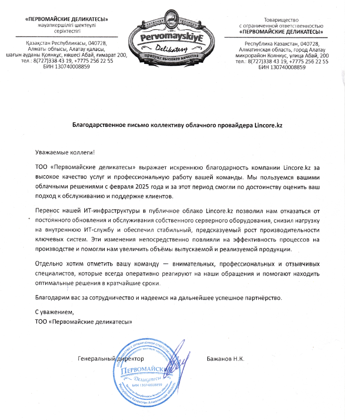 В феврале 2025 года ИТ служба ТОО "Первомайские деликатесы" при поддержке нашей технической команды осуществила миграцию бизнес - задач производства в облачную среду Lincore.kz. В ходе реализации проекта были решены такие задачи как: своевременное планирование вычислительных ресурсов по требованию бизнеса, повышение отказоустойчивости и доступности ИТ систем, повышение информационной безопасности и снижение нагрузки на внутреннюю ИТ службу организации. Все эти факторы положительно сказались на повышении производительности предприятия в целом.