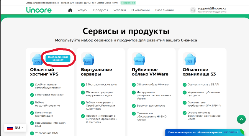 Для тех пользователей, кто зарегистрировался и арендовал виртуальные серверы до 1 сентября 2025 года, теперь вход в личный кабинет располагается на странице Виртуальные серверы VPS - Lincore.kz